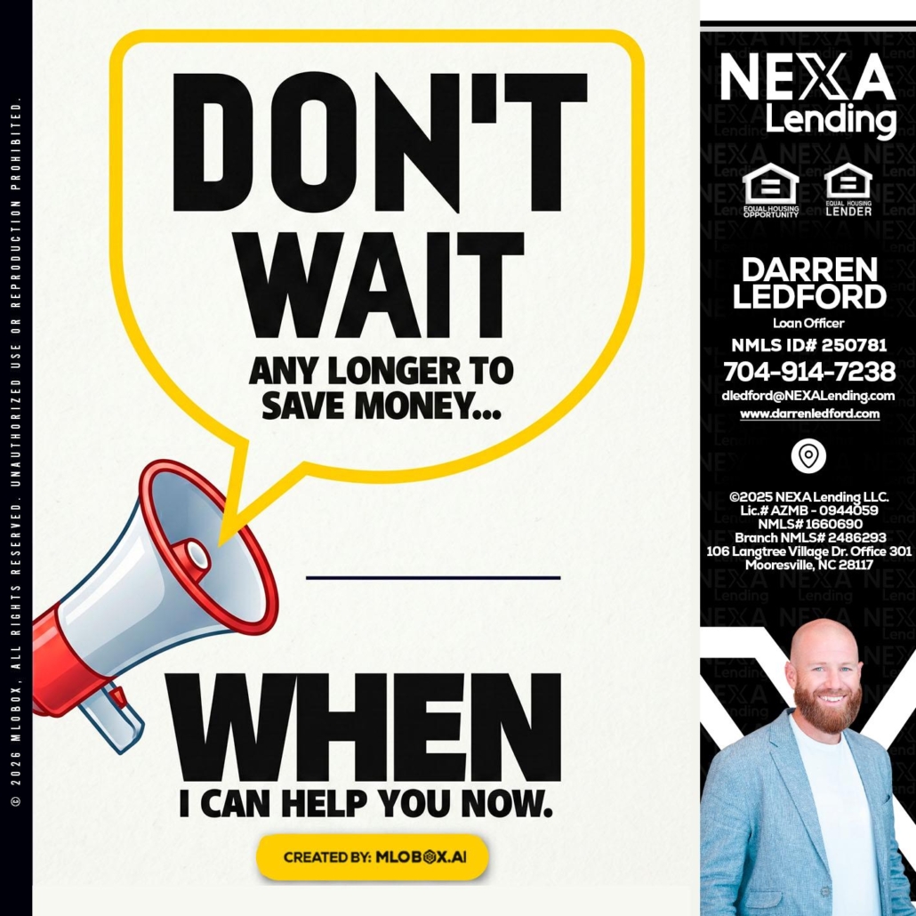 DONT WAIT - Darren Ledford -Loan OfficerHi, my name is Darren Ledford. I’m a Loan Officer with NEXA Lending LLC., offering personalized mortgage solutions, fast customized quotes, great rates and service with integrity.