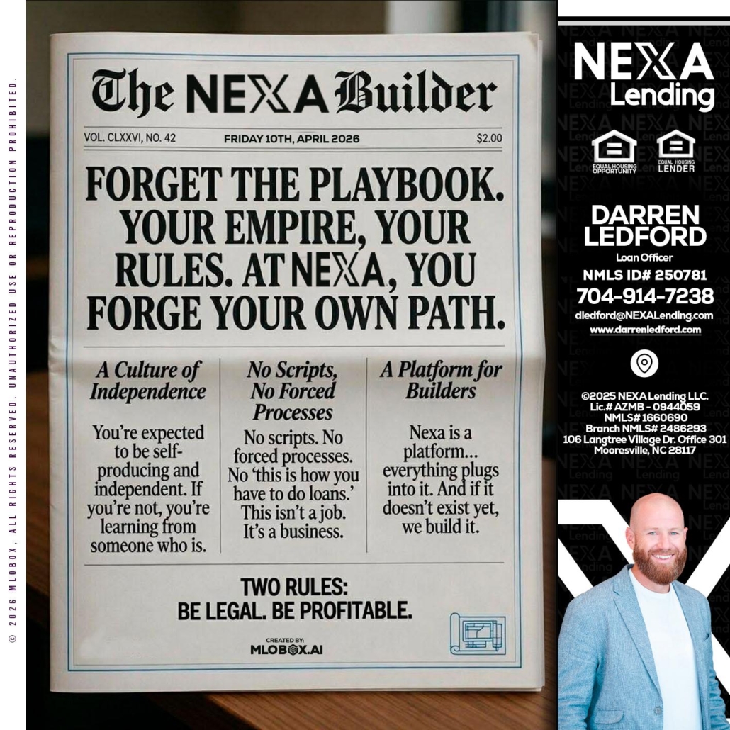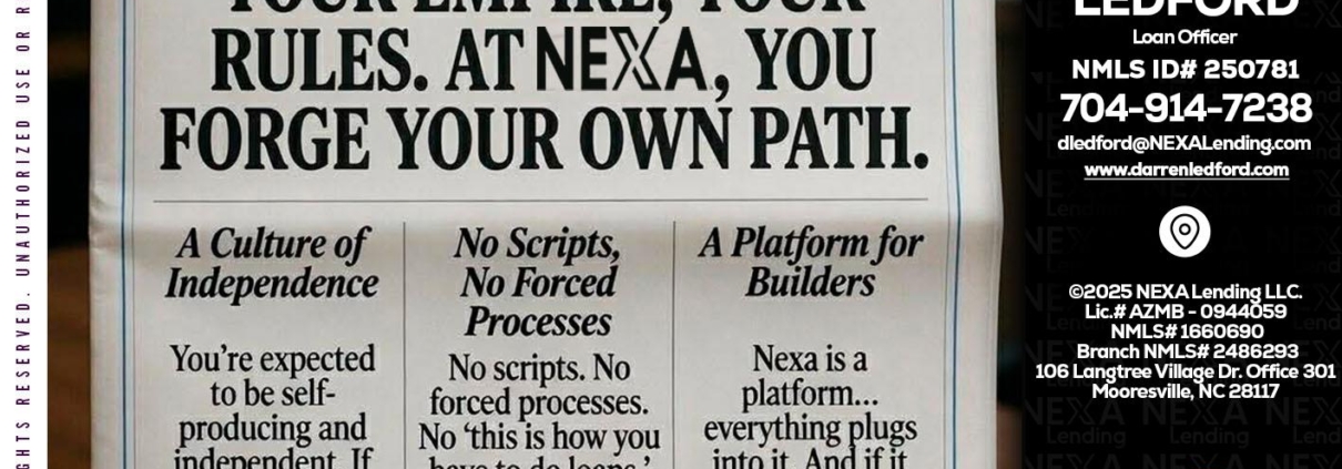 Hi, my name is Darren Ledford. I’m a Loan Officer with NEXA Lending LLC., offering personalized mortgage solutions, fast customized quotes, great rates and service with integrity.